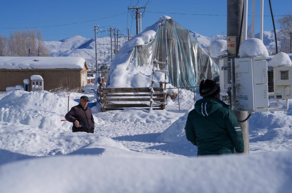 1月16日,吐尔洪乡的村民在门前小院内清理积雪。新华社记者 胡虎虎 摄