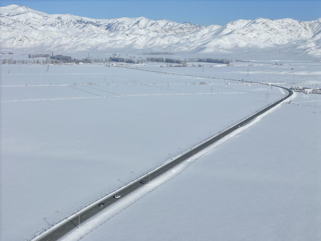 1月17日,车辆行驶在由富蕴县城通往可可托海镇的公路上(无人机照片)。新华社记者 胡虎虎 摄