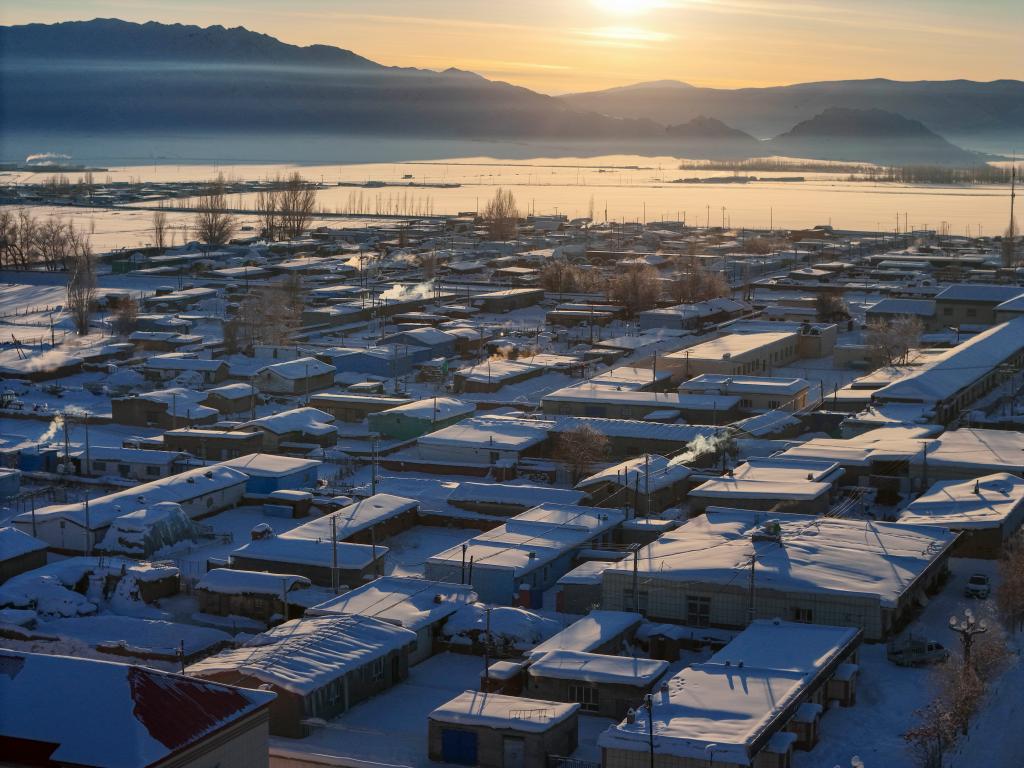 1月16日,夕阳映照下的吐尔洪乡的村庄(无人机照片)。新华社记者 胡虎虎 摄