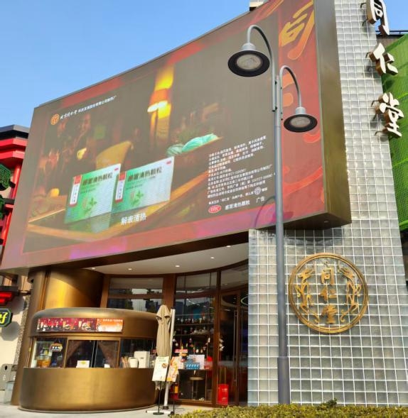 在同仁堂北京环球大道药店,惊艳奇幻的大型裸眼3D户外大屏上播放着北京同仁堂的宣传片:同仁堂双龙标LOGO的金龙飞出屏幕活灵活现,京制牛黄解毒片“京小牛”IP形象手持灭火器为大家在干燥冬季送去舒爽……震撼的视觉效果打破平面传播限制,让同仁堂的品牌与产品以灵动的形式与公众互动。