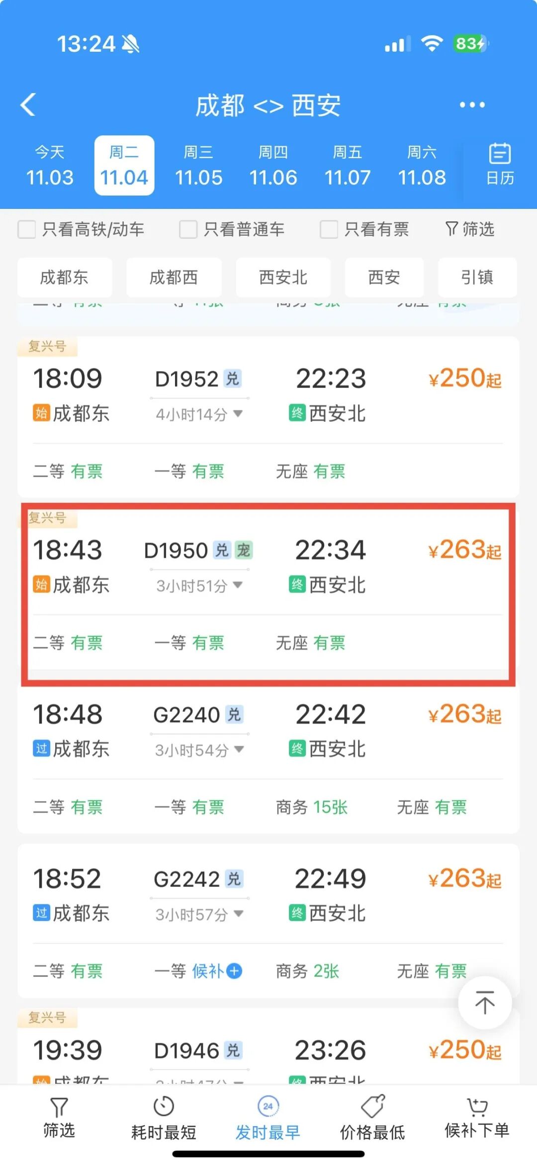 在12306App输入行程后,认准车次列表中“兑”字标识,即可兑换车票。100积分抵1元,不足部分可混合支付。