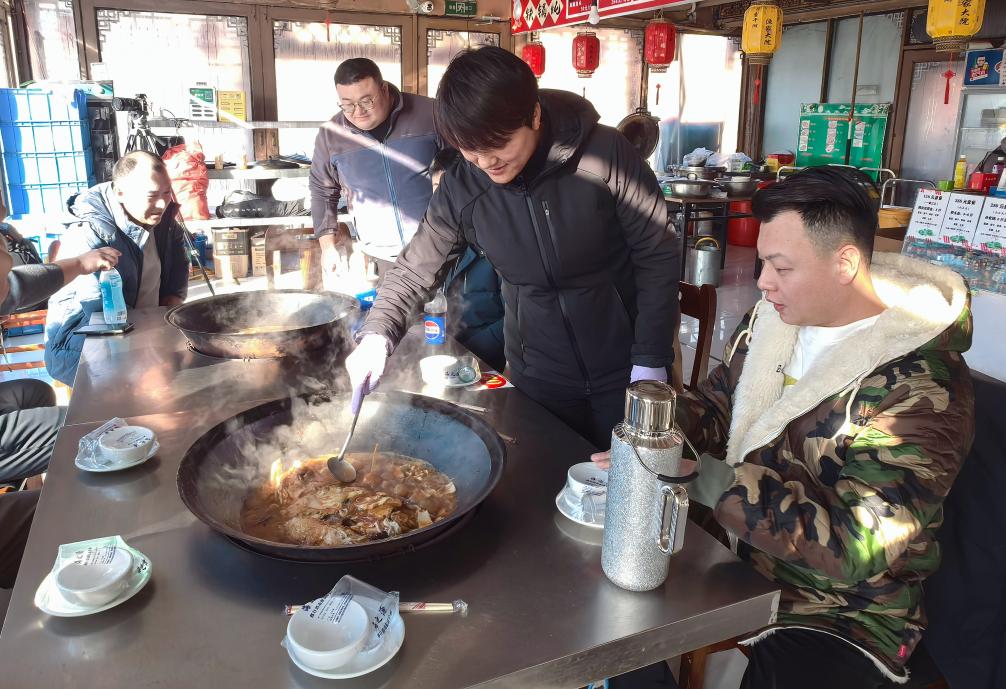在查干湖渔家大院饭店民宿里,老板朱娇(右二)正在为游客烹制铁锅炖胖头鱼。新华社记者 孙鹏程 摄