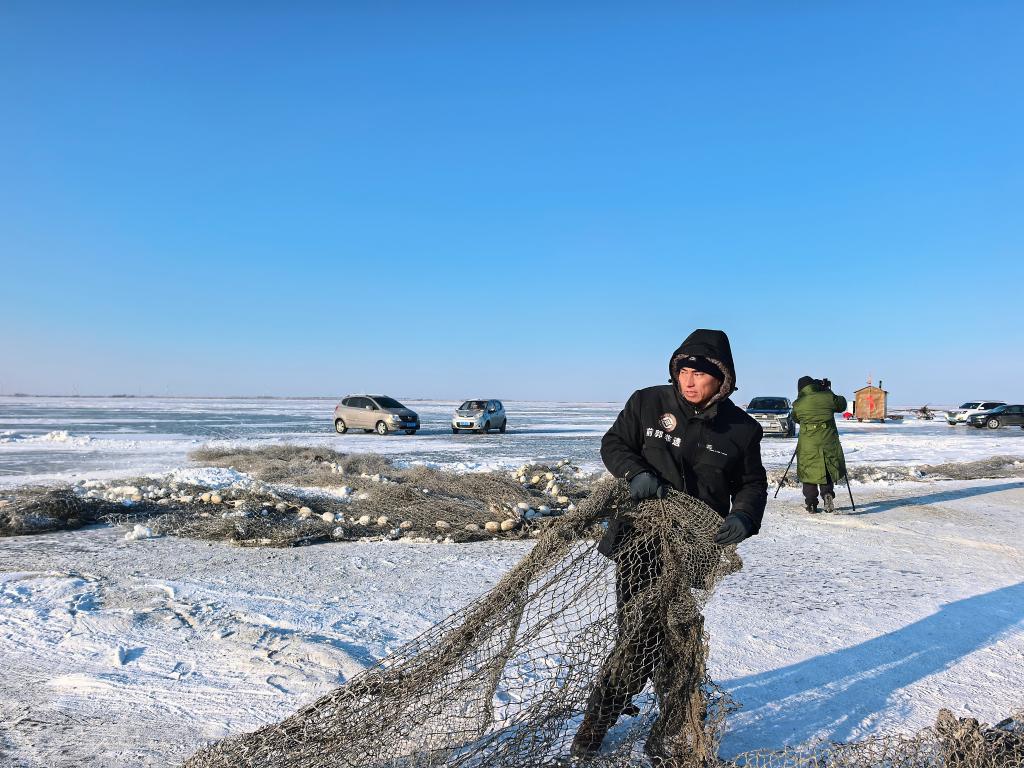 渔把头是捕鱼队伍的领头人,48岁的邴海龙就是其中一位。“这冰面平均有70公分厚,而湖水则有6米多深,我们在冰面上凿出一个入网冰洞和一个出网冰洞,把湖里的大鱼给网上来。”邴海龙说,每张渔网长约1200米、宽约1000米,网眼有6寸大,做到只捕大鱼、不捞小鱼。