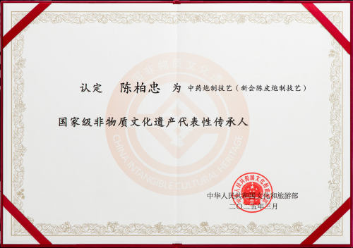 2025年 10月,陈柏忠获颁国家级非物质文化遗产新会陈皮炮制技艺代表性传承人证书