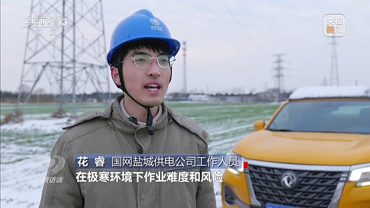 国网盐城供电公司工作人员 花睿:传统人工除冰不仅效率低,还面临登高作业的严寒冻伤、高空坠落等安全风险,在极寒环境下作业难度和风险更是翻倍。而无人机挂载撞击式除冰装置,能在极寒环境下稳定作业。