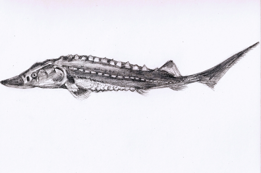 中华鲟生长较快,体型硕大,最大个体体长可达4米,体重可达680千克,最长寿命可达40龄以上 上海海洋大学学生手绘
