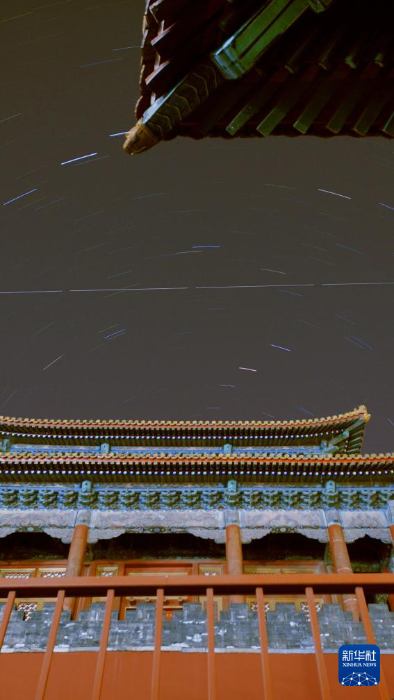 1月24日在北京使用智能天文望远镜拍摄的中国空间站从故宫上空飞过的轨迹(画面中部横线)。新华社记者 邢广利 摄