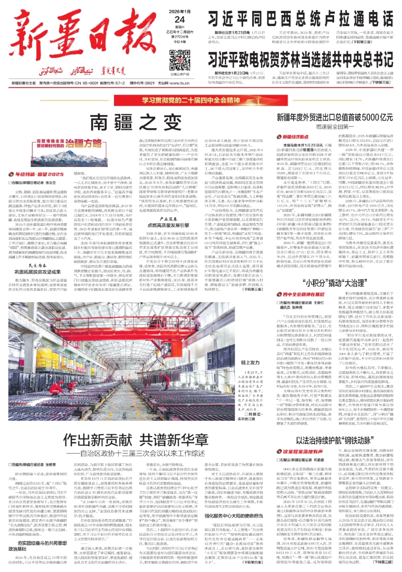2025年是新疆发展历程中具有重要里程碑意义的一年。这一年,新疆完整准确全面贯彻新时代党的治疆方略,站在全局高度和长远角度认识南疆地位之重要、工作之艰巨、破题之紧迫,全力做活南疆“棋眼”,统筹推进南北疆协调联动发展,着力破解制约南疆发展的突出问题,推动南疆工作不断取得新进展、发生新变化。