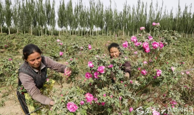 2025年8月28日,于田县奥依托格拉克乡农民在玫瑰种植基地采摘玫瑰。许晓龙摄
