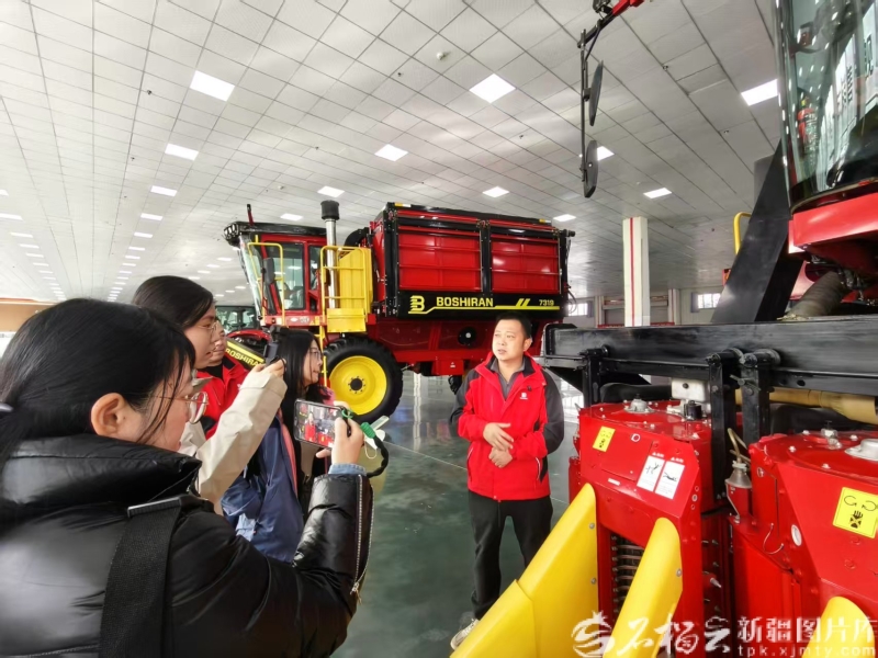 2025年10月22日,沙雅钵施然智能农机有限公司工作人员向媒体采访团介绍智能采棉机生产情况。郭文摄