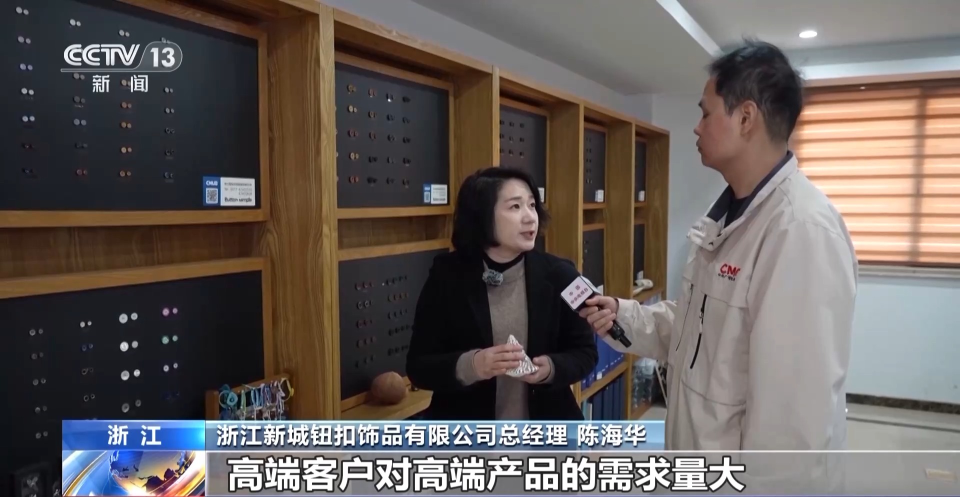 浙江新城钮扣饰品有限公司总经理 陈海华:高端客户对高端产品的需求量大,所以我们通过这个点子开发不同的产品和材质,从而提升产品的附加值。