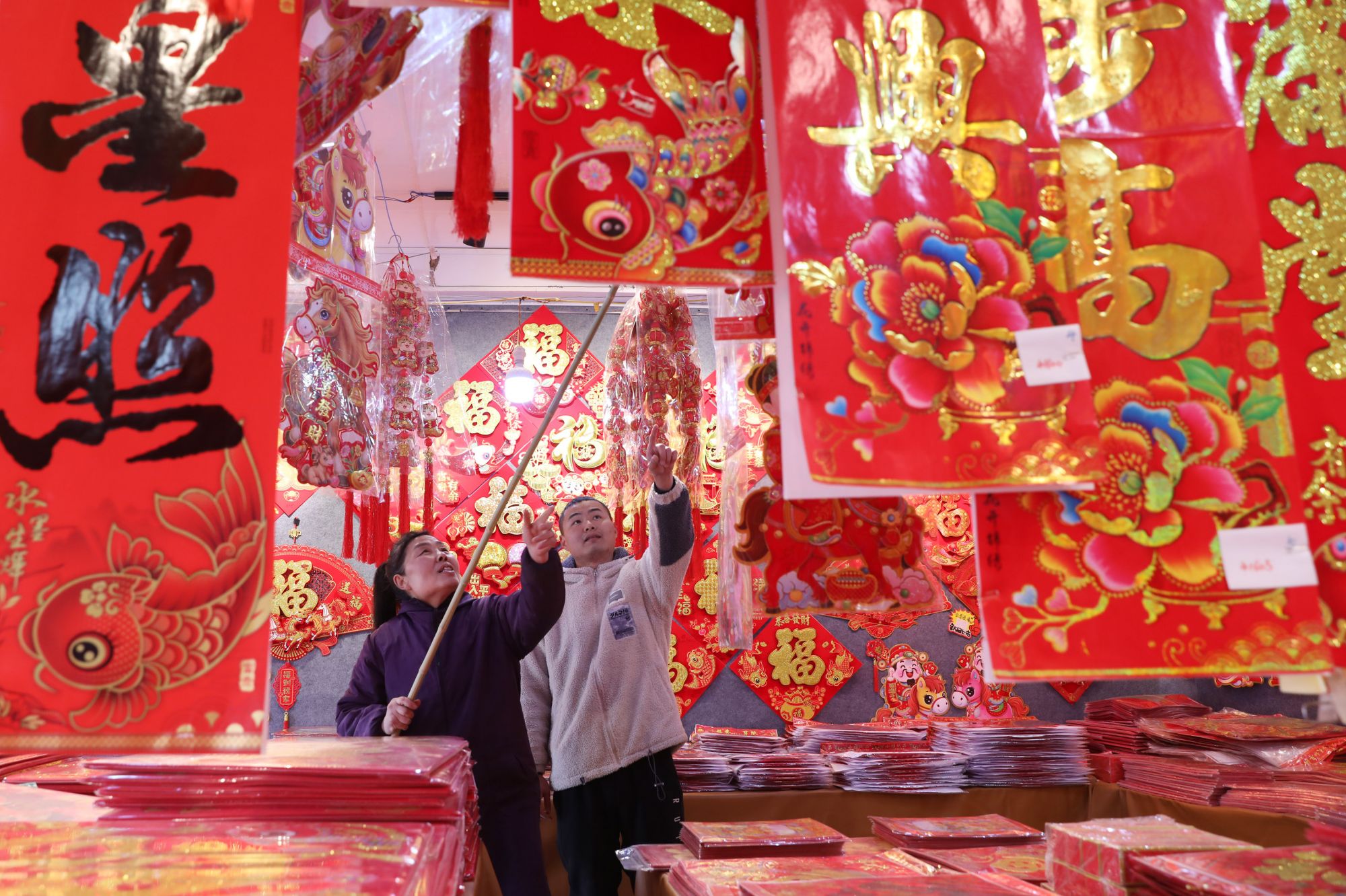 1月25日,顾客在河南省焦作市温县赵堡镇赵堡村年货市场选购春联、年画。新华社发(徐宏星摄)