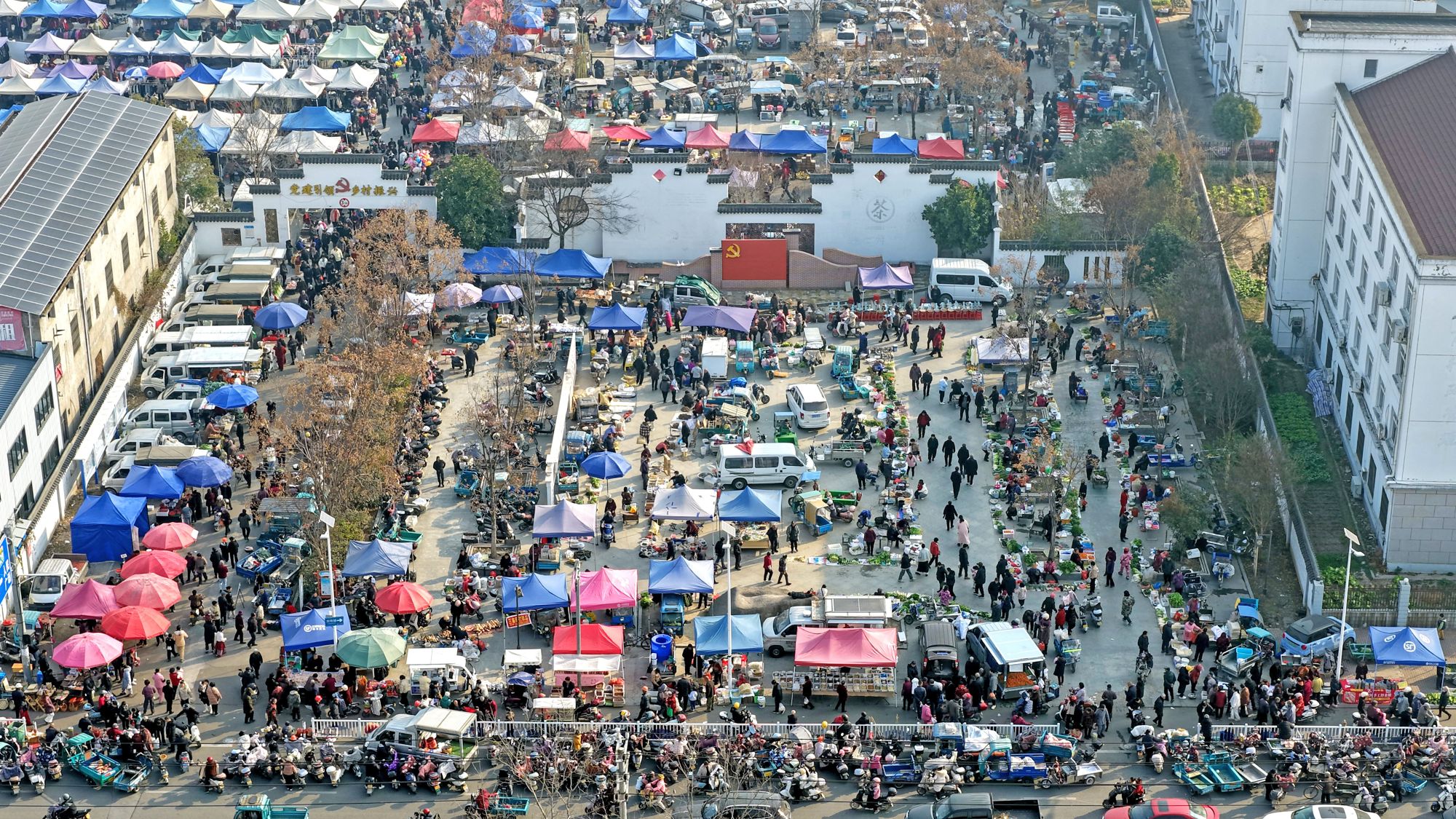 1月25日,人们在浙江省台州市仙居县下各镇大集选购年货(无人机照片)。新华社发(王华斌摄)