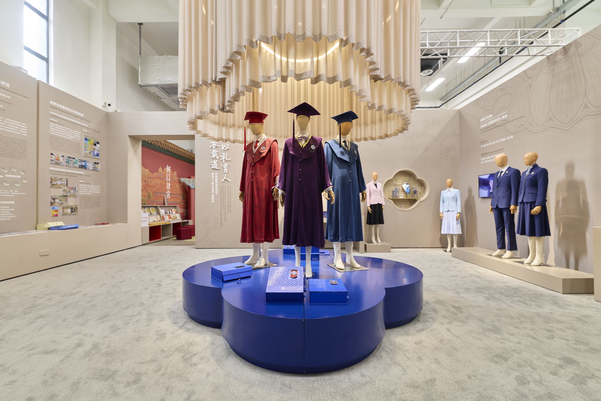 北师大未来设计学院“美育浸润”教学成果展现场,展示了学院特聘教授叶锦添设计的北师大学位服