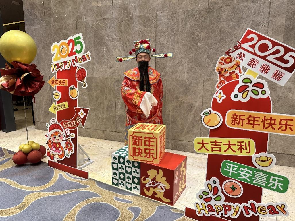财神送福添好运,惊喜好礼随机享:酒店三楼宴会厅活动区域,身着喜庆财神服饰的工作人员将化身“福气使者”,随机为宾客派送巧克力金币、吉祥花生等寓意美好的小礼物。金币象征招财进宝,花生寓意岁岁平安,每一份惊喜都承载着酒店的新春祝福,让现场氛围持续升温,好运常伴左右。