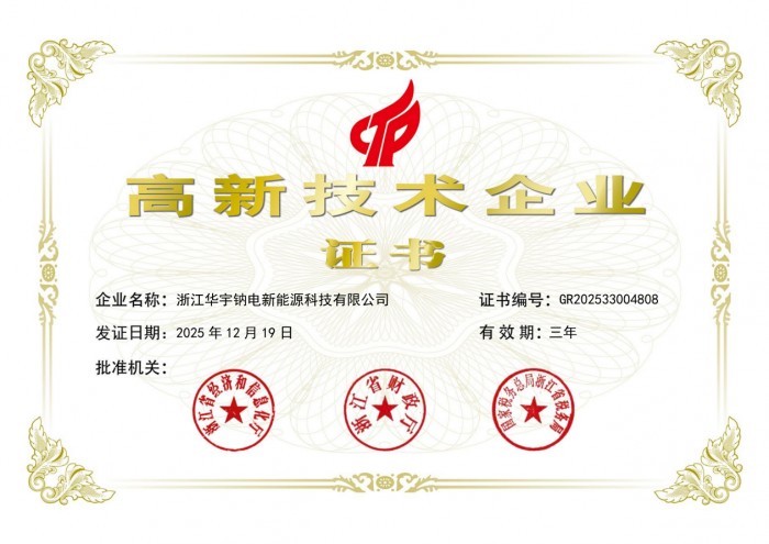 凭借在钠电领域持续的技术创新与深厚积累,雅迪华宇钠电已成功入选国家高新技术企业。这不仅是对其研发实力与产业贡献的权威认可,也为钠电池的产业化推广提供了有力支撑。