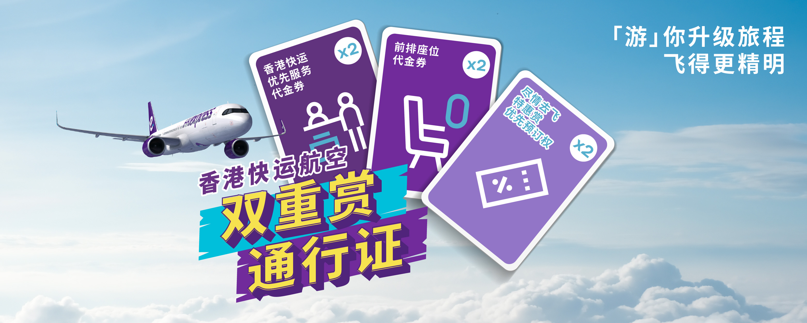 「双重赏通行证」*于2026年1月29日至1月31日期间,在香港快运航空指定网站^限量发售。优惠名额有限,先到先得,售完即止。立即购入,一证在手,全年快人一步,与香港快运一起尽情去飞!
