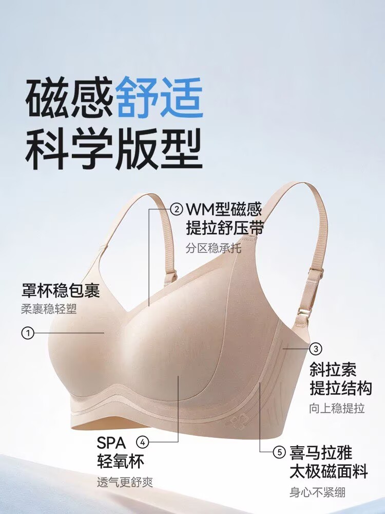 小黑磁SPA轻氧杯轻薄无厚重感,依托WM型磁感提拉与斜拉索结构两大专利,上稳托下减压,大胸无负担、小胸自然聚拢,规避普通内衣的短板,同时,结合3D立体杯型,达到“动静皆稳”。