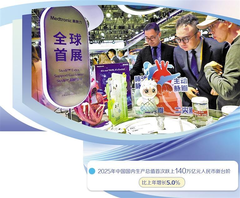 中国国家统计局日前发布数据显示,2025年中国国内生产总值首次跃上140万亿元人民币新台阶,比上年增长5.0%。多位跨国企业负责人表示,中国经济顶压前行、稳中有进、向新向优,展现出的韧性、活力与确定性,增强了企业对中国市场的信心,也印证了中国市场蕴含着广阔机遇,企业将进一步深化在华布局,共享中国经济发展红利。