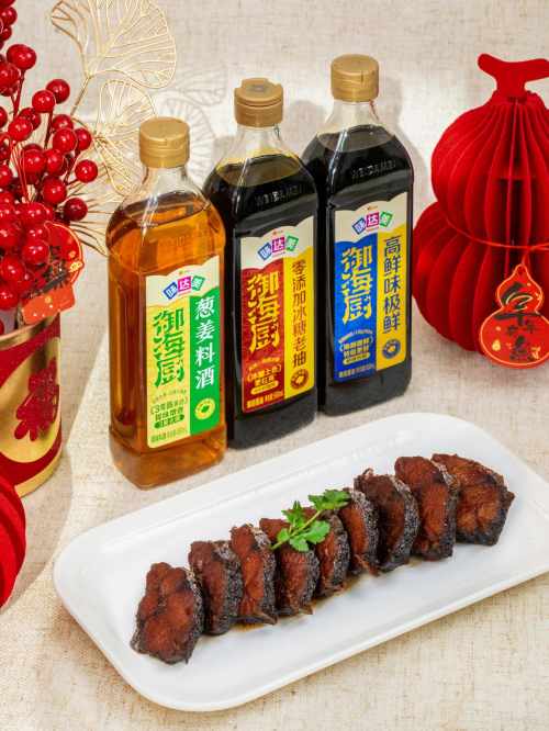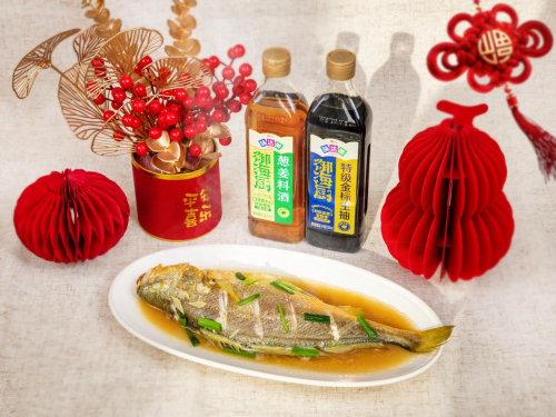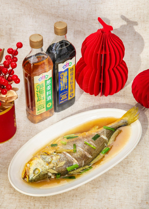 红烧鱼对“色”和“香”的要求很高,而味达美与米其林餐厅主厨共创的味达美御海厨零添加冰糖老抽,则赋予了这道菜自然色泽和复合鲜甜,里面添加了慢熬4小时的冰糖,免炒糖色,是名厨上色红亮的秘诀;再搭配一步就能去腥提鲜的味达美御海厨葱姜料酒,激发香味,让红烧味型稳定呈现,成菜更有年夜饭的视觉分量感。