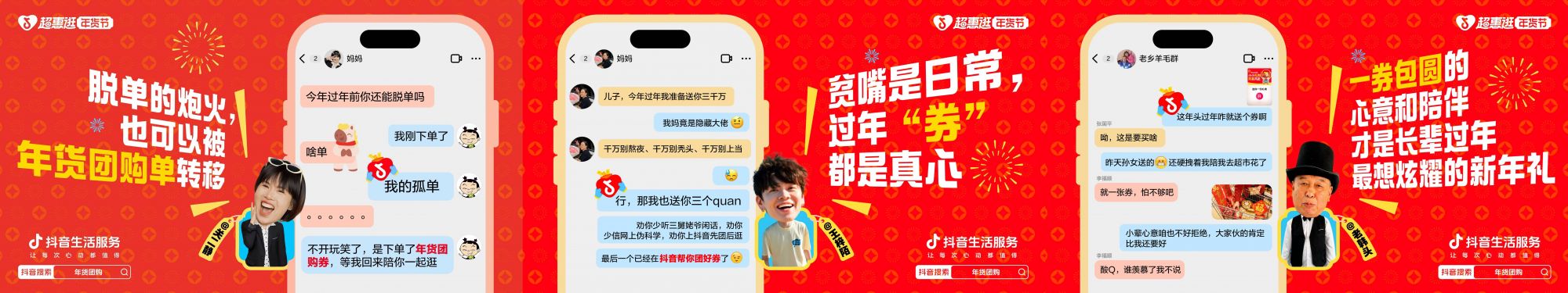 @关二静 用团购单转移妈妈对“脱单”的关注,把券变成了“陪你”的承诺;@王梓陌 用年货券温柔化解与家人的辩论,稳稳拿捏老妈的注意力。@老韩头 跟朋友炫耀券里的心意,这才是长辈最想晒的“年货”……一张年货券就能让送礼的小辈和收礼的长辈都开心,快给自家长辈都安排上!