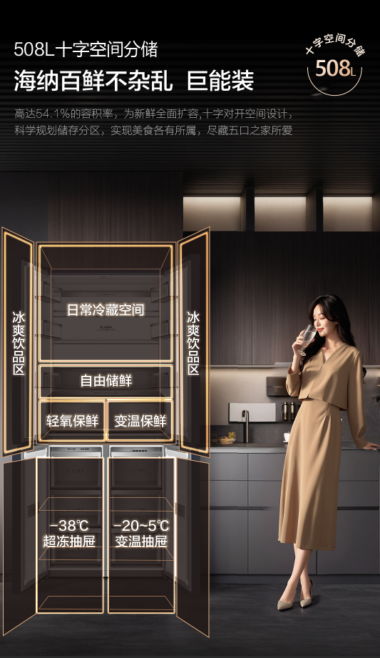 · 508L或512L大容量配合十字对开分区设计,满足现代家庭的多元化存储需求,同时保持超薄机身的空间优势。