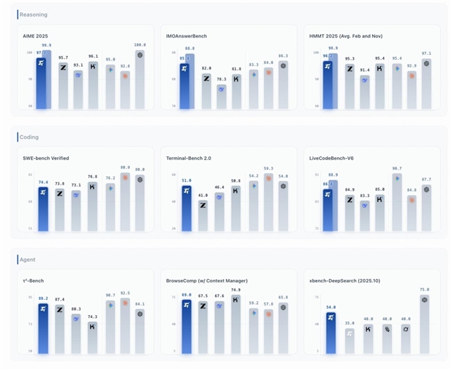 在针对智能体能力的 τ²-Bench、、BrowseComp 等测试,以及 LiveCodeBench V6 代码挑战和 AIME 2025数学竞赛中,Step 3.5 Flash 均取得了亮眼成绩,且在 Agent和数学任务上极具竞争力。这意味着当其面对需要结构化输出的多步推理、复杂逻辑求解、后端自动化和长时间运行等任务时,已具备支持企业级应用落地能力,尤其适用于高频工具调用和对行为可预测性有强要求的系统环境。