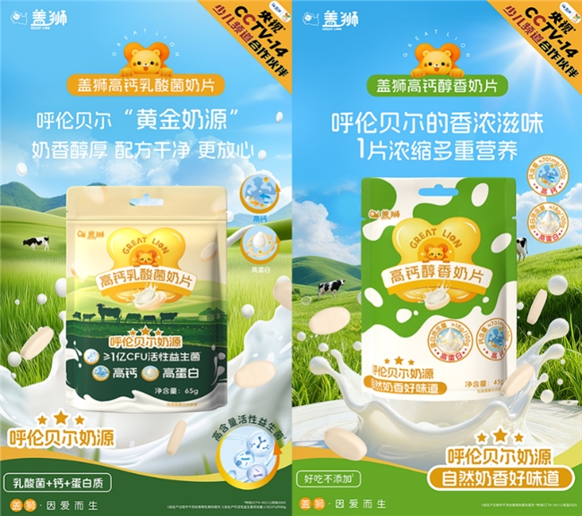 在奶片这一细分零食赛道上,盖狮也进行了创新。现有研究及资料表明,乳酸菌作为重要的益生菌类群,具有改善人体肠道菌群平衡、抑制肠道病原菌繁殖等功能。(*此处仅指乳酸菌的作用,不代表产品功效)盖狮高钙乳酸菌奶片优选包括植物乳植杆菌、鼠李糖乳酪杆菌等“明星菌株”,活性益生菌添加量≥1亿CFU/100g。与呼伦贝尔优质奶源结合,浓缩成一颗颗钙与蛋白质的含量约为等重量牛奶的6倍(牛奶的钙、蛋白质含量参考《中国食物成分表标准版》)的奶片。单片独立包装的设计,让全家都可以随时分享,摄入营养可以像吃零食一样简单,轻松融入办公室养生与家庭健康管理的日常。