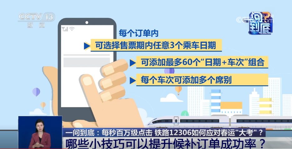 中国铁路12306技术中心运行保障部负责人张志强介绍,候补购票功能的核心算法逻辑是,当出现退票、改签或铁路新增列车产生其他票源时,系统会按照候补订单生效的时间顺序自动兑现车票。数据显示,从29日凌晨到29日16时已提交455万笔订单了,截至现在已16个小时,累计兑现了45万张,并且这个数字在不断变化。在提交候补时有一些技巧,比如在提交订单时,可以选择日期加车次的多个组合,提交的车次越多,兑现的成功率越高。