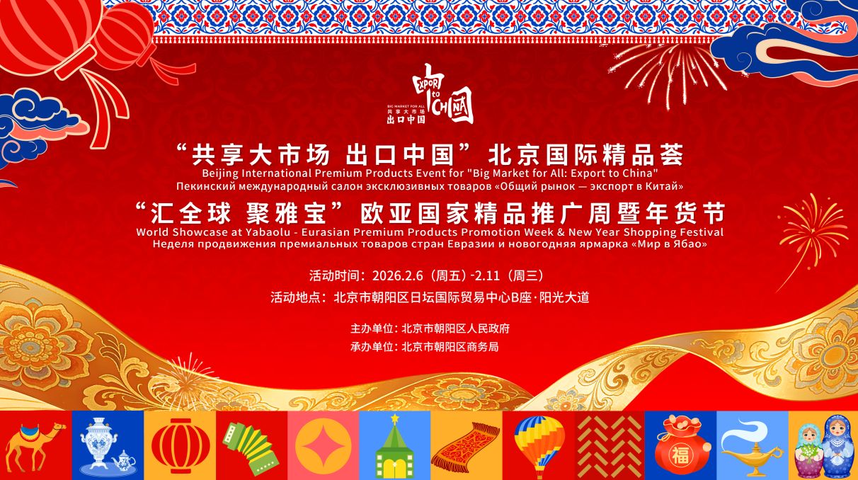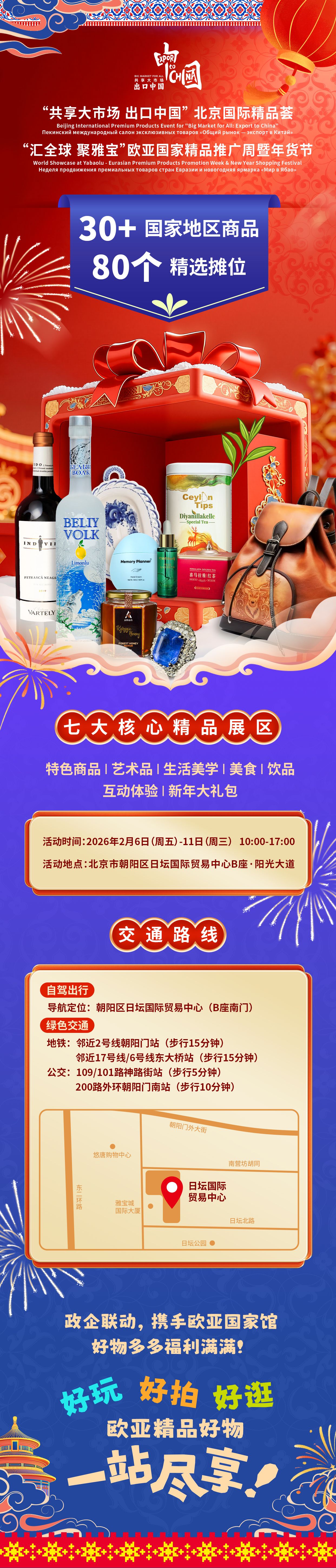 年味渐浓,采购、送礼清单该更新啦!备受期待的“共享大市场 出口中国”北京国际精品荟——“汇全球聚雅宝”欧亚国家精品推广周暨年货节,将于2026年2月6日至11日在北京朝阳区日坛国际贸易中心阳光大道举办。活动汇聚来自30个欧亚国家及地区的特色商品,配备了专业的购物服务,还设置了丰富的互动体验活动,在北京朝阳就能一站式跨享欧亚精品,为新春佳节增添多元文化氛围。