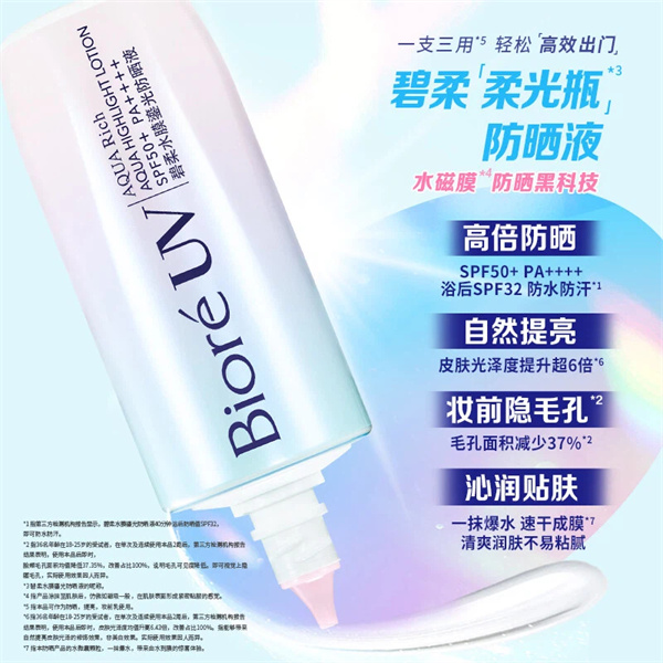 随着消费者防晒需求日趋多元,除了关注防晒指数外,提亮肤色、修饰毛孔等附加价值也备受关注。为持续满足人们不断进阶的防晒期待,花王旗下“碧柔(Bioré)”品牌于2026年2月,全新升级推出“碧柔水膜鎏光防晒液(碧柔柔光瓶)”。不仅具备PF50+PA++++的高倍*2防晒力,更新增防水防汗*1功能,结合独特的三色珠光立体调色配方,可自然提亮皮肤超6倍*3、妆前隐匿毛孔37%*4,实现一瓶三用、高效*2出门,为大家带来多元化的防晒体验。