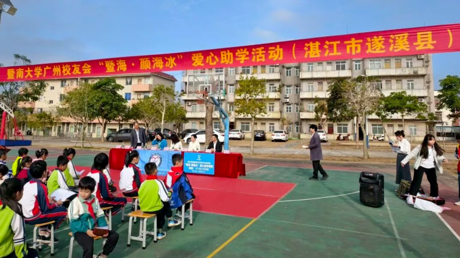 活动现场暖意融融,各界爱心人士齐聚一堂。遂溪县教育局领导、爱心捐赠方暨南大学广州校友会执行会长颜海冰女士、广州市暨海慈善基金会秘书长陈莹女士、林晓文主管、钟采霖志愿者等到场与10所乡村小学的师生们见证这场善意的传递。