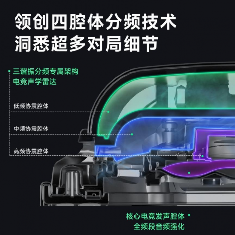 这款耳机的核心竞争力,源于对FPS痛点的精准破解:历经420天深度研发,研发团队跨越7省征集30位职业选手、100名主播的反馈,最终打造出四腔体声学系统——通过“脚步声低频腔体+人声中频腔体+枪声高频腔体+核心发声腔体”的独立协震架构,实现三频分轨同步追踪,既压制了枪声的刺耳高频,又精准凸显脚步声、换弹声等关键信息,让玩家在三角洲行动中轻松建立对局信息差。