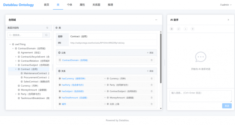 对于生成的本体或全新构建的本体,平台提供了强大的可视化建模器。用户可以在“类”、“属性”、“个体”等视图下,直观地设计和管理复杂的业务概念体系。