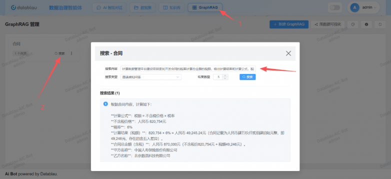 基于此,系统进一步构建高质量的GraphRAG:将合同、制度、需求文档等非结构化内容自动映射到本体语义之上,实现“文档—数据—关系”的统一建模。大模型不再只是检索文本,而是沿着本体关系进行语义约束与推理计算。