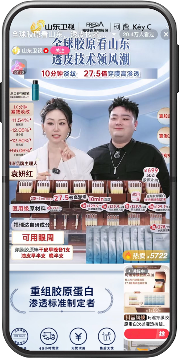 近日,福瑞达生物股份旗下品牌珂谧(KeyC)携手山东卫视与北京晨路科技共同打造的“全球胶原看山东,透皮技术领风潮”直播专场圆满收官。品牌主理人袁妍红空降山东卫视官方直播间,创下单场直播GMV超280万元、累计曝光突破3600万的佳绩,刷新了山东卫视历史带货纪录,进一步证明了珂谧(KeyC)的市场认可度与科技实力。