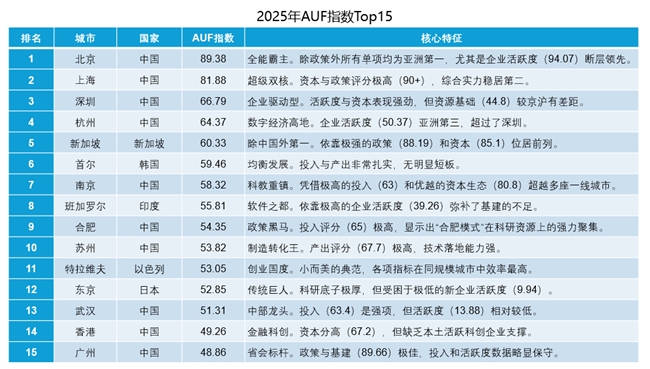 在AUF指数的版图中,中国城市凭借庞大的体量占据了头部位置,而亚洲其他国家的中心城市呈现出截然不同的“创新进化路径”。