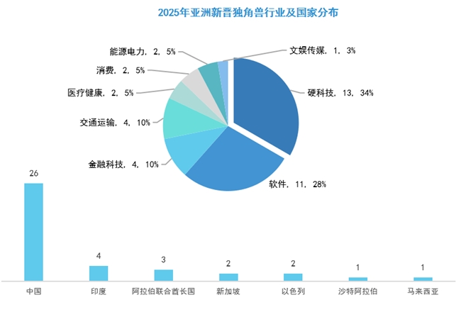 2025年,亚洲新晋39家独角兽企业,总估值约为2207.71亿美元,平均估值约为56.61亿美元。其中硬科技(13家,34%)和软件(11家,28%)行业居多,金融科技(4家,10%)以及交通运输(4家,10%)行业其次,其余为医疗健康(2家,5%)、消费(2家,5%)等行业。