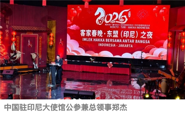 “数百年来,客家先民怀揣崇文重教、诚信友善的优良传统,远渡南洋来到印尼,与当地各族人民相融共生、守望相助。”中国驻印尼大使馆公参兼总领事郑杰在“2026客家春晚·东盟(印尼)之夜”活动现场致辞时表示,客侨群体在扎根印尼的漫长岁月中,既坚守了自身的文化根脉,更以真诚与担当搭建起中印尼民间交流的坚实桥梁。“天下客家是一家,这份跨越山海的血脉亲情与文化认同,是连接中印尼人民心灵的重要纽带。”他寄语广大客家乡亲,要继续传承和弘扬客家精神,既要当好客家文化的传承者,让优良传统代代相传;也要当好民间交流的使者,持续深化两国民众的相互了解与友谊;更要当好合作共赢的纽带,以文化交流为契机,推动中印尼在更多领域实现互利共赢,让客家文化在新时代绽放更绚丽的光彩。