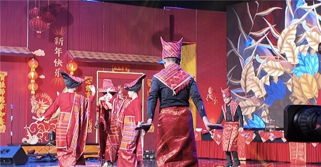 晚会现场,多元文化碰撞迸发精彩火花。北苏门答腊卡罗族舞蹈团演绎的《MburingManggis–MejuahJuah》,与客家春节“祈福纳祥”的传统年俗深度契合,传递出人类共通的情感追求。印尼梅州会馆昂格隆乐队40位艺术家携手,用印尼传统竹筒乐器昂格隆演奏中国风新年旋律,传递着印尼深厚的文化底蕴,与梅州客家风情遥相呼应。