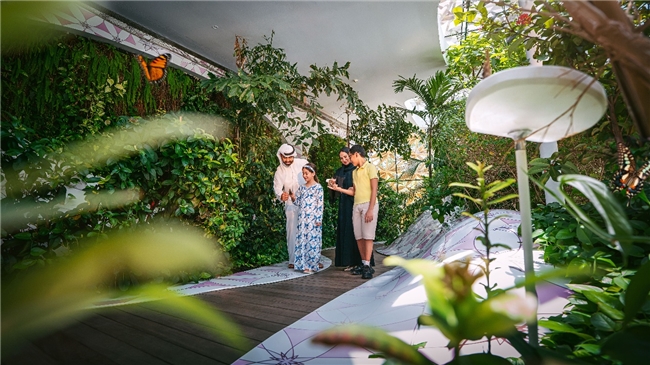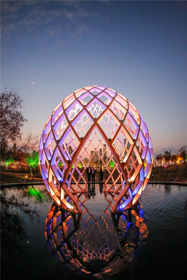 岛上分布着数座极具观赏性的艺术装置与雕塑作品:会变色的“OVO”巨型“彩蛋”、反射天光绿意“Torus”镜环、致敬蝴蝶迁徙轨迹的“Flutter”光学装置、隐藏在草木之间的“Columns”彩绘立柱群、见证地球沧桑变迁的化石岩、灵感源自阿联酋采珠史的秋千……艺术爱好者在这里,眼睛和相机都会忙不过来。
