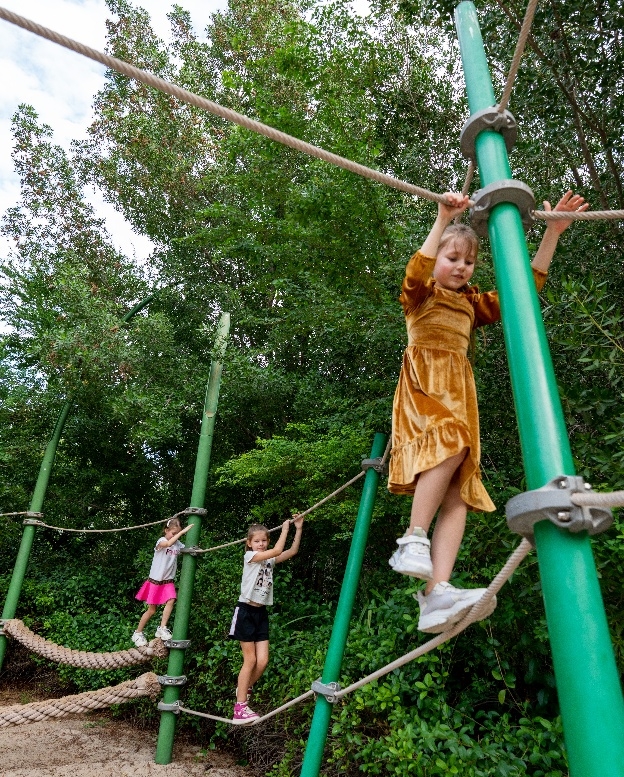 儿童游乐场藏在自然怀抱里,攀绳、蹦床、秋千、捉迷藏……让孩子安全撒野。大人则可以走进纯白简约的文学馆(Literature Pavilion),看书、发呆,享受片刻宁静。