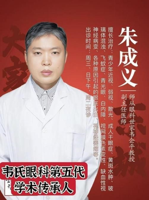 朱成义,副主任医师,东城中医医院特聘专家,出诊时间:周二夜诊,周四夜诊、周六下午、周日下午。毕业于北京中医药大学,从事眼科临床工作26年,师从眼科世家韦企平教授,曾先后到北京同仁医院、北京中医药大学东方医院、温州医科大学眼视光医院进修。我国著名的“韦氏眼科”第五代学术继承人,第五批全国名老中医药专家学术经验继承人。擅长治疗:青少年近视防控、干眼、黄斑水肿、玻璃体混浊,飞蚊症,青光眼、白内障、视网膜色素变性、缺血性视神经病变、各种原因引起的眼底出血、视神经萎缩、青光眼性视神经病变、视神经炎、葡萄膜炎、视网膜静脉阻塞、糖尿病眼病、巩膜炎、虹膜炎、儿童及成人眼部抽动症等眼科常见疾病及疑难病。