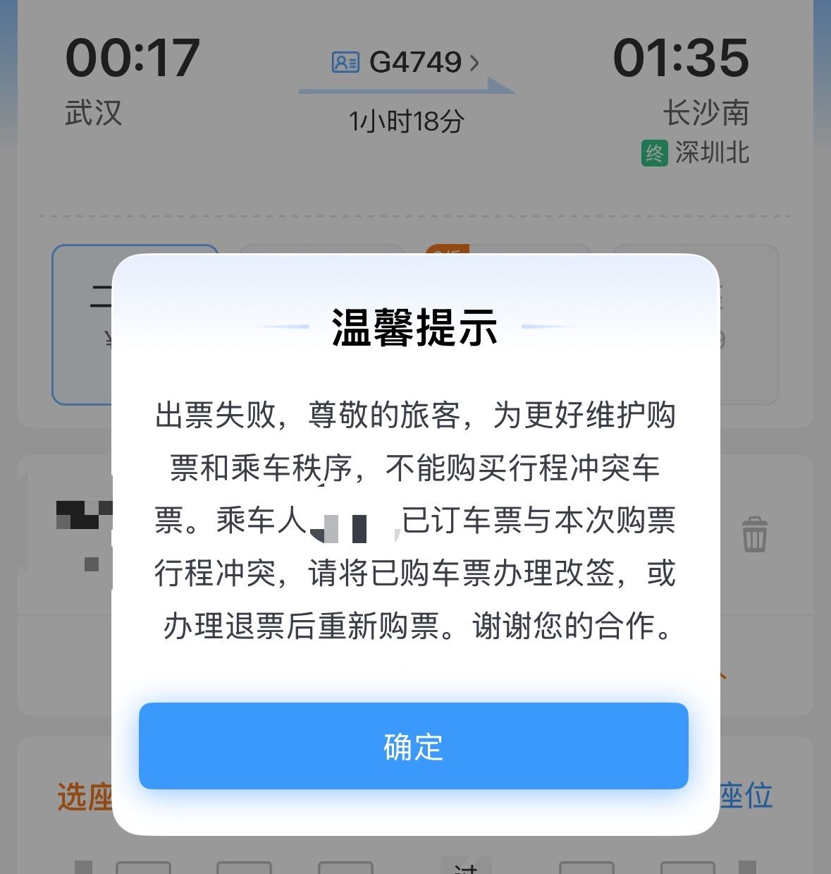 12306App提示出票失败,已订车票与本次购票行程冲突。屏幕截图