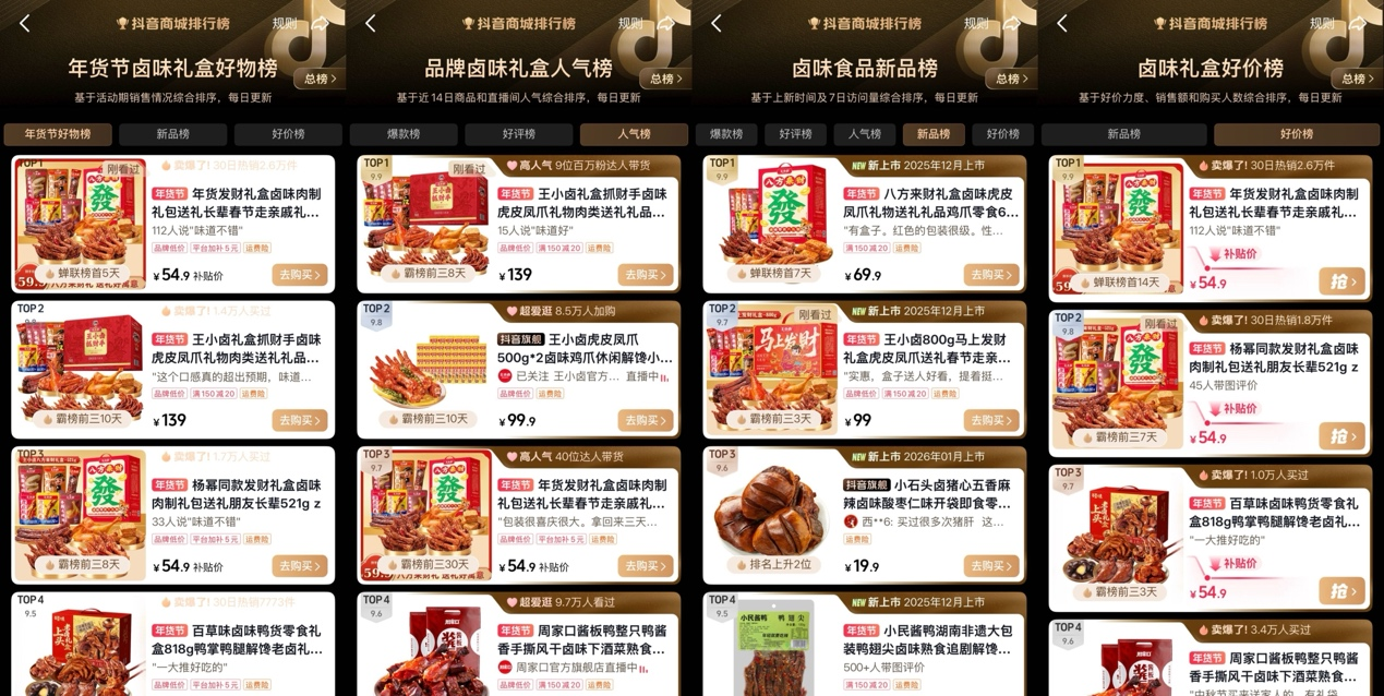 王小卤礼盒礼包抢占年货C位,登顶抖音礼盒多个榜单