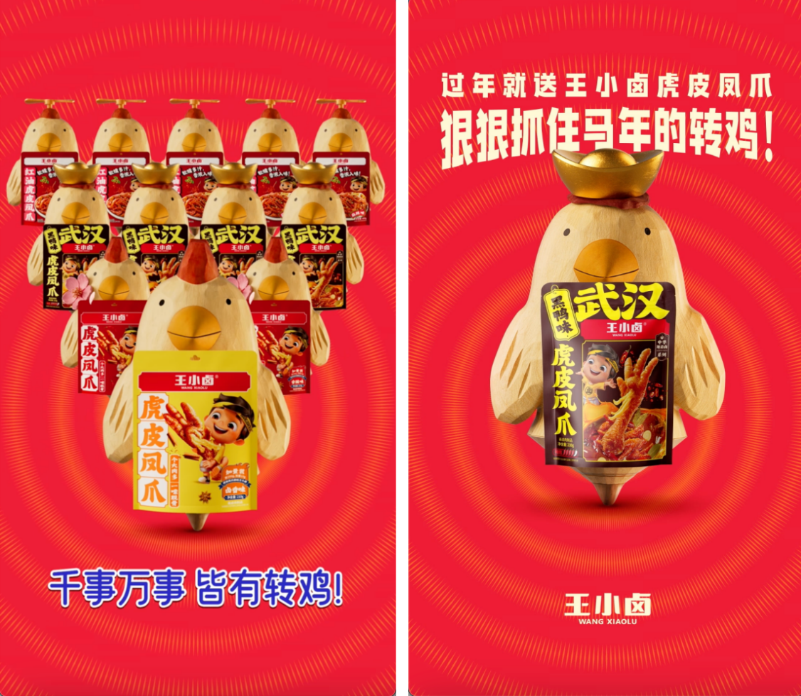 当各大品牌在临近农历新年期间扎堆“马年”玩梗、陷入生肖符号的内卷竞争时,卤味零食品牌王小卤另辟蹊径,推出抽象、搞怪的好运IP“转鸡”,“蹲一个转鸡”“吃鸡爪蹲转鸡”迅速击中年轻人的情绪共鸣,在社交平台上掀起一阵抽象却热烈的新年接“转鸡”、接好运的风潮。