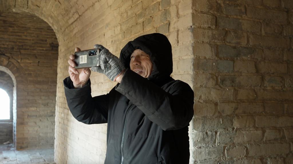 尹成武正在巡查敌楼情况并拍照留存记录。新华社记者 张哲 摄