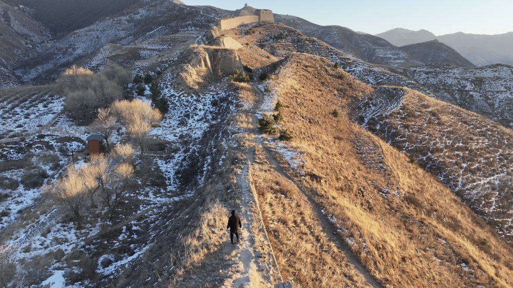 这道修筑于明洪武七年的边墙,东接雁门关,西望宁武旧城,是国内现存包砖较为完整的明长城遗存之一。长城保护员尹成武踩着碎石与冻土混杂的小路在山上走着,对身后的年轻人提醒道:“踩实了,这段路滑。”