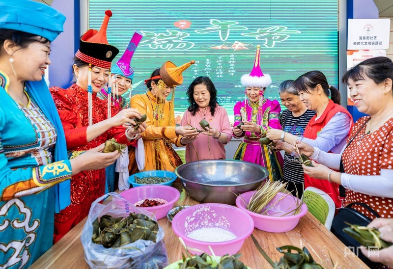 2025年端午节,各民族居民聚集在清泉街社区里共同包粽子(央广网发 丁根厚 摄)
