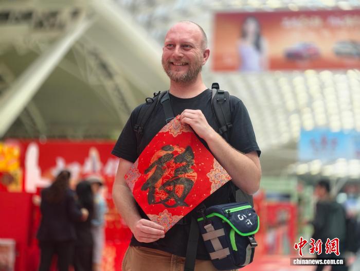 一名外国旅客被红纸墨香吸引,从书法家那里取得了一个“福”字。“新年快乐,谢谢。”他将福字拿在手中,一边拍照留念,一边笑着用中文说道。